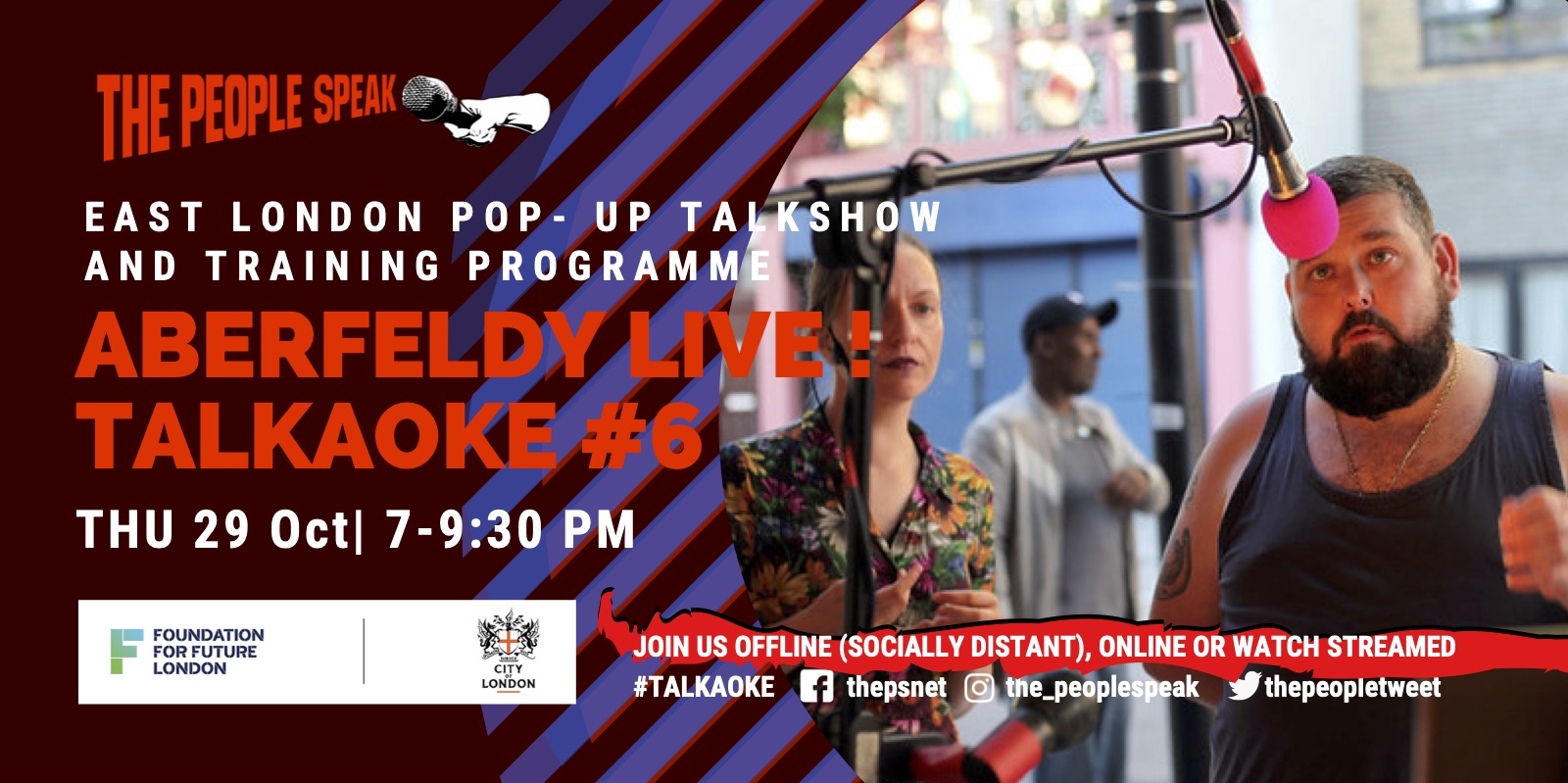 Welcome to Part 6 of the experimental online / offline session of Aberfeldy Live! Talkaoke – a pop up talkshow by The People Speak. Every last Thursday of each month we will report live from the streets of Poplar and through Zoom about the subjects that matter to you.