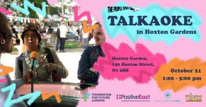 Welcome to Talkaoke – an interactive pop-up talkshow, where you, the participants, set the agenda. We are teaming up with Hoxton Trust, Positive East andEast London Caresto bring Talkaoke back to Hackney! Join us at Hoxton Garden [156 Hoxton Street, N1 6SH] and let’s chat about all things local and global.