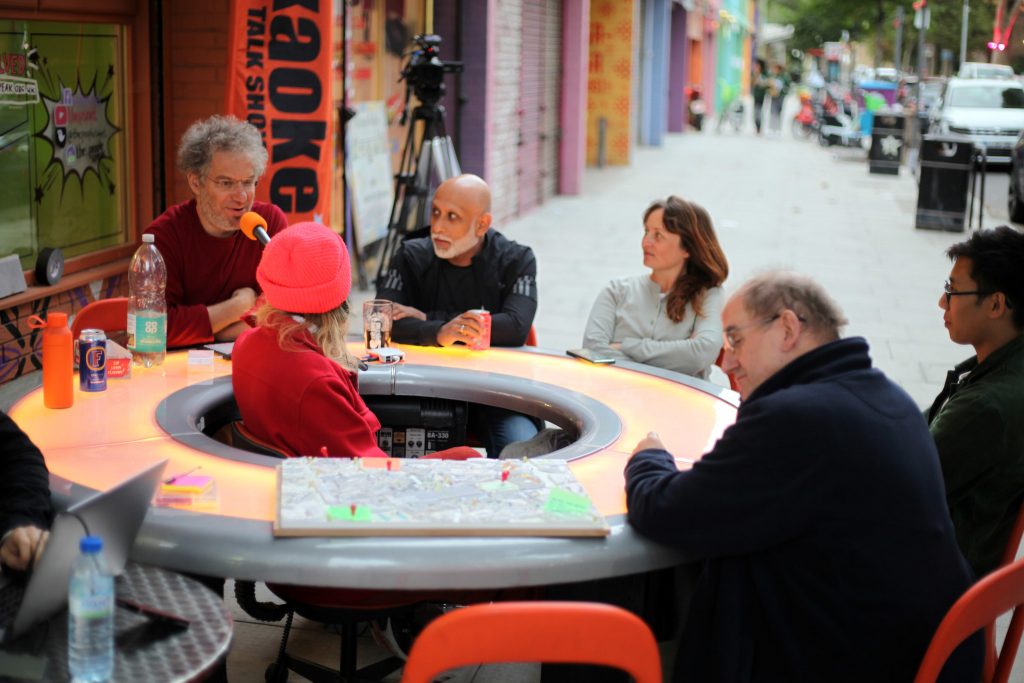 Talkaoke is an interactive pop-up talkshow, where you, the participants, set the agenda. Every  month we report live from the streets of Poplar and further afield via Zoom about all the matters local and global. The format is simple: the Talkaoke host sits in the middle of a round table and you, the participants, sit at small tables close by. Each table has a mic and you are invited to talk about anything they like. Each discussion is a journey from one unexpected subject to another: it can be topical, funny, deep, surreal, and everything in between. The conversation will be visualised live by a digital illustrator! It’s a drop in – so feel free to stay for as long or as little as you can.