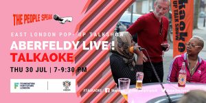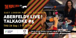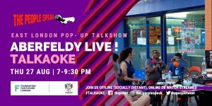 Find out more »Monthly online / offline Talkaoke events and a facilitation training programme in Poplar! Supported by Foundation For Future London Over the next 12 months, The People Speak will be taking a micro tour of Aberfeldy Street, popping up in the Perfect Fried Chicken, the Londis, The Tommy Flowers Pub, the church, the mosque and on the street – getting conversations going between the people we find there. Talkaoke is an interactive talk show where the agenda is set by the…