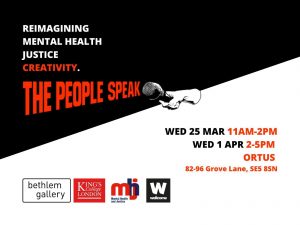 Find out more »We are inviting everyone with lived or professional interest in mental health to join us for two initial sessions. Contribute your ideas & opinions to an exciting research project, which recites the intersection between mental health, justice and creativity. Commissioned by The Bethlem Gallery, The People Speak Art Group will facilitate a new artwork which responds to the mental health and justice research project - mhj.org.uk https://www.youtube.com/watch?v=8BMiWLM60xg&list=PLBGb692vvmMEGusn32-MlnDxoJQUG6juZ